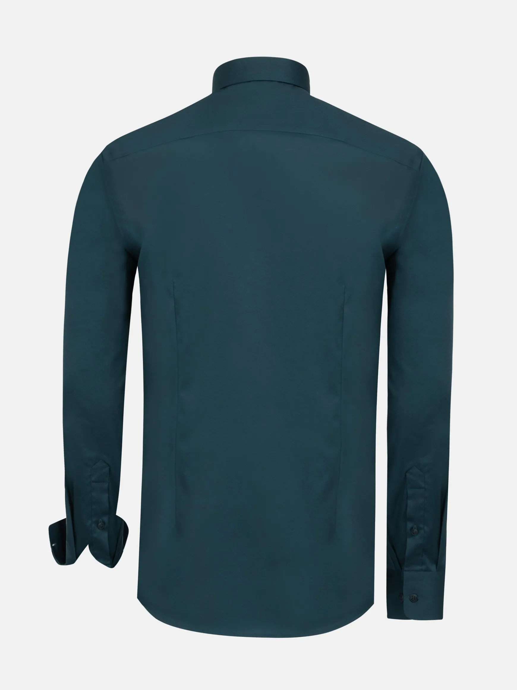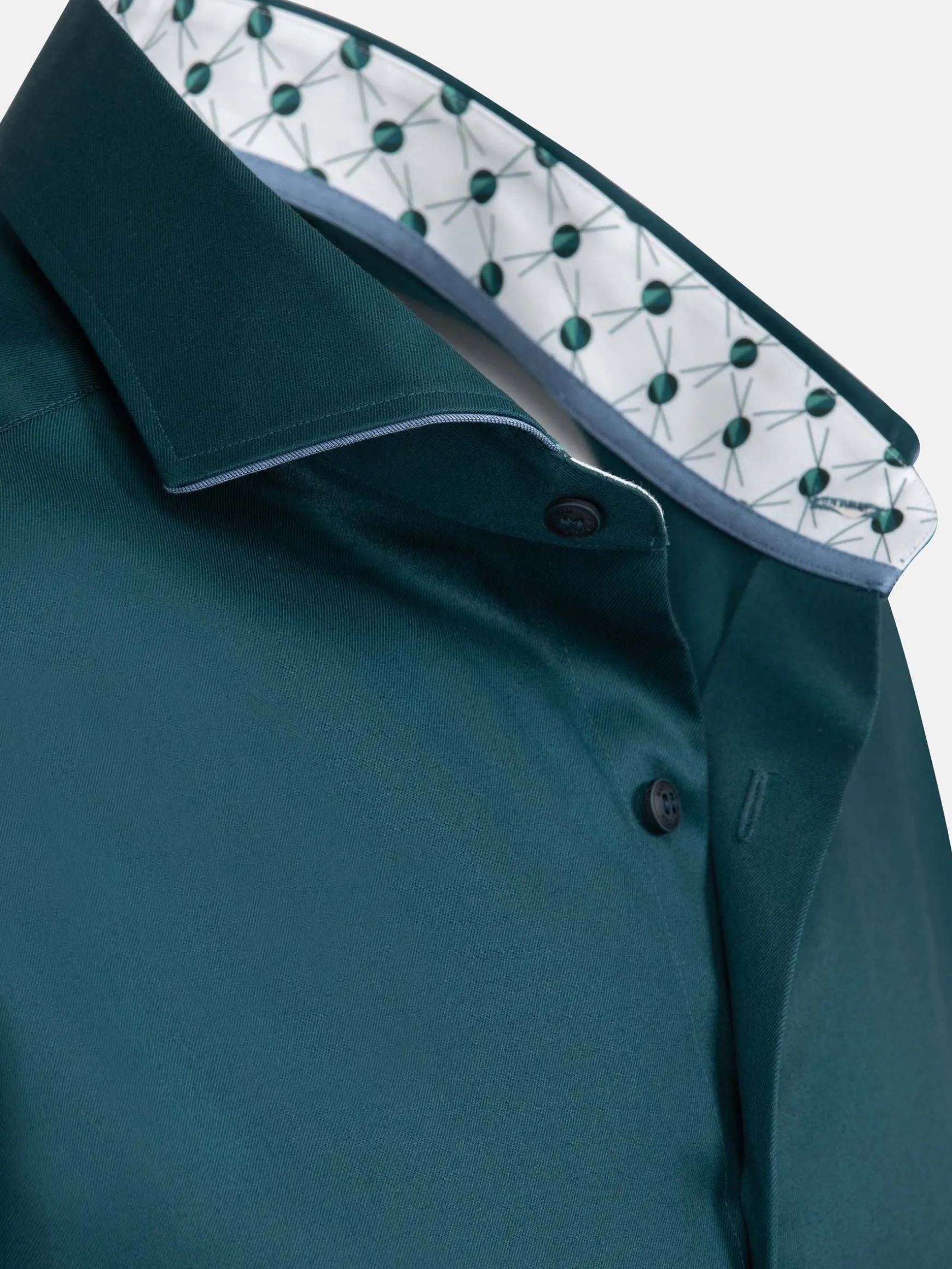 Petrol overhemd met cognackleurige knopen en doorlopende bies. Het overhemd heeft een mooie glans en verschillende details. De binnenkant van de kraag en manchet heeft een leuk stippenpatroon.