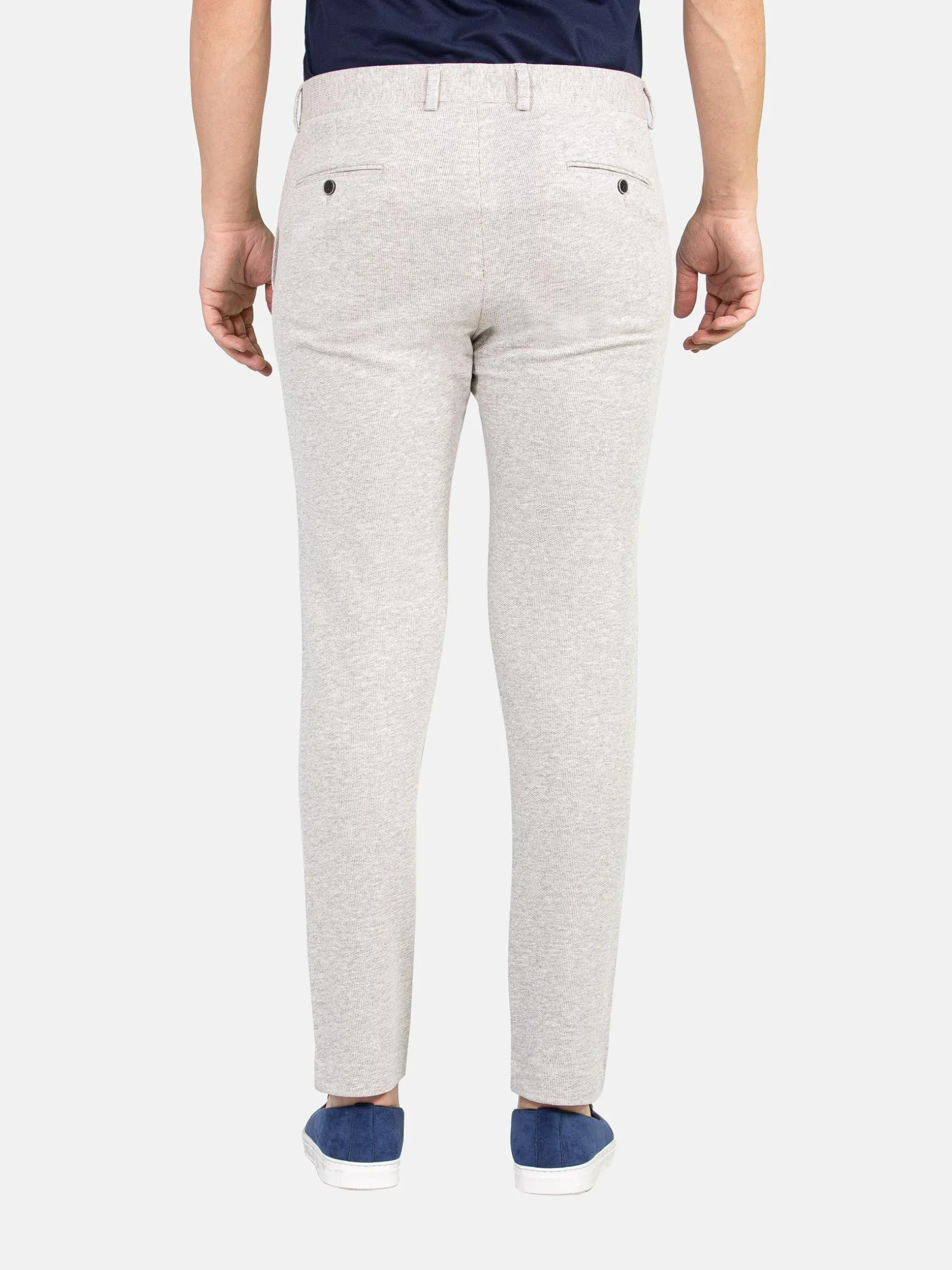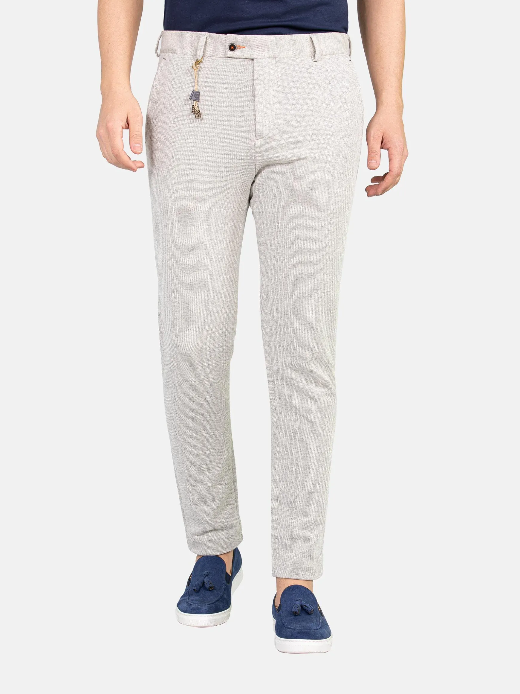 Stijlvolle, grijze pantalon met ritssluiting. Door de stof voelt de pantalon heel zacht aan. Dit ontwerp heeft aflopende pijpen en twee steekzakken aan de voor- en achterzijde.