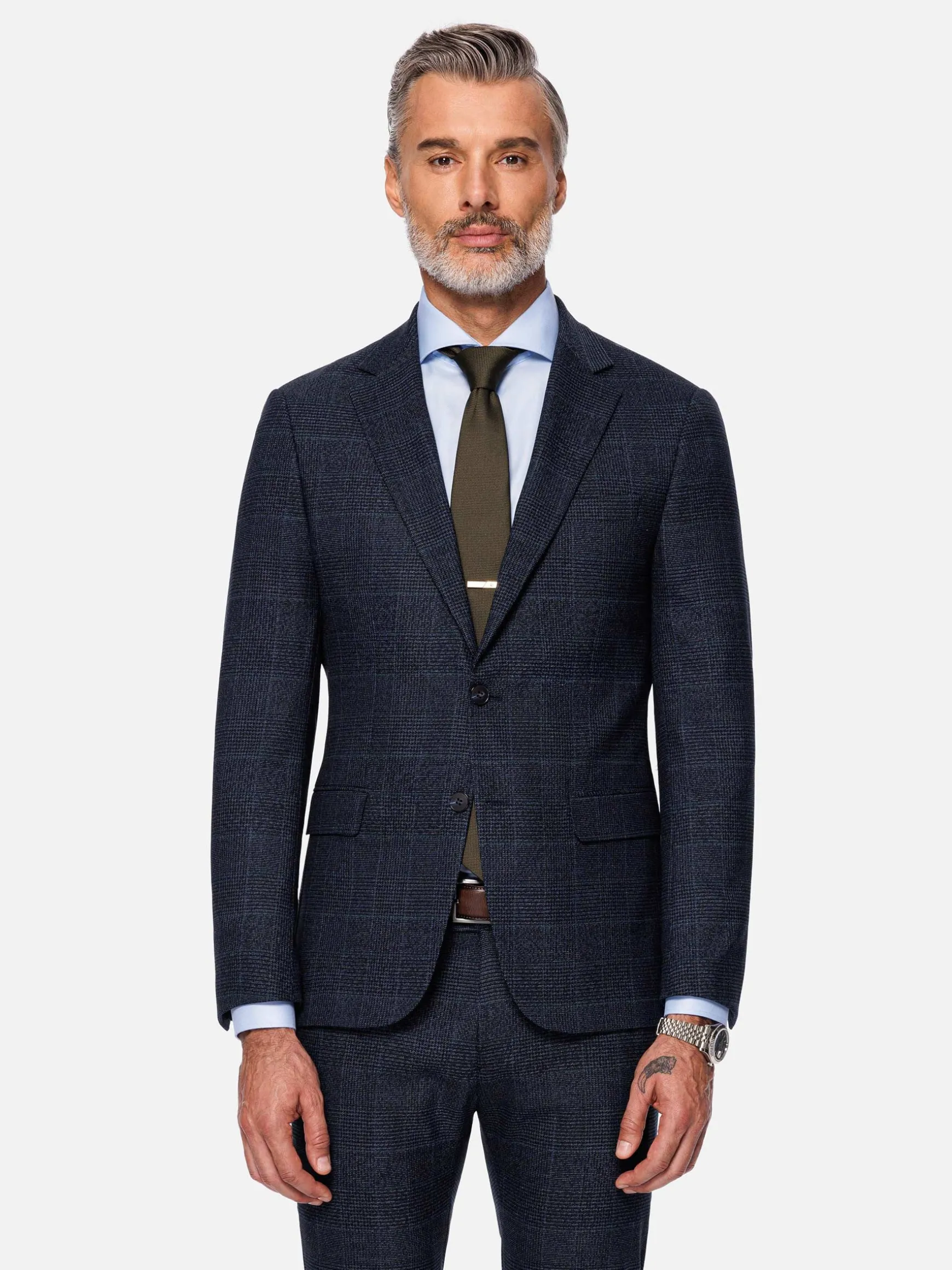 Amalfi Glen Check Wide Lapel Navy Suit Blazer is een tijdloos stuk dat klassieke elegantie combineert met modern raffinement. Het is gemaakt van een eersteklas mix van polyester, viscose en elastaan en biedt duurzaamheid, comfort en krasvastheid. Het heeft een brede revers, een moderne pasvorm en een eenborstig ontwerp met twee knopen. De blazer heeft ook een borstzak en klepzakken, waardoor het een veelzijdige keuze is voor verschillende gelegenheden.