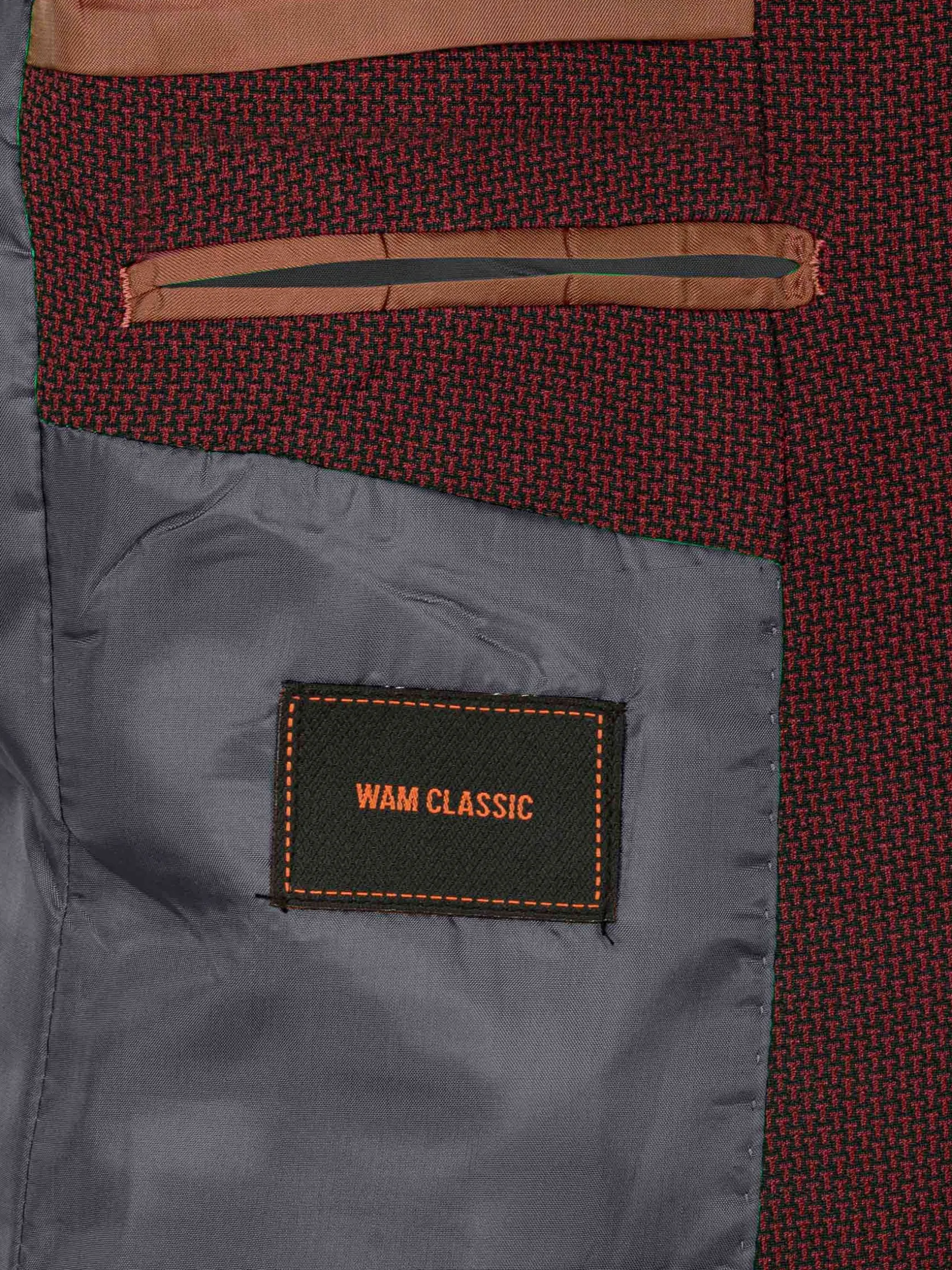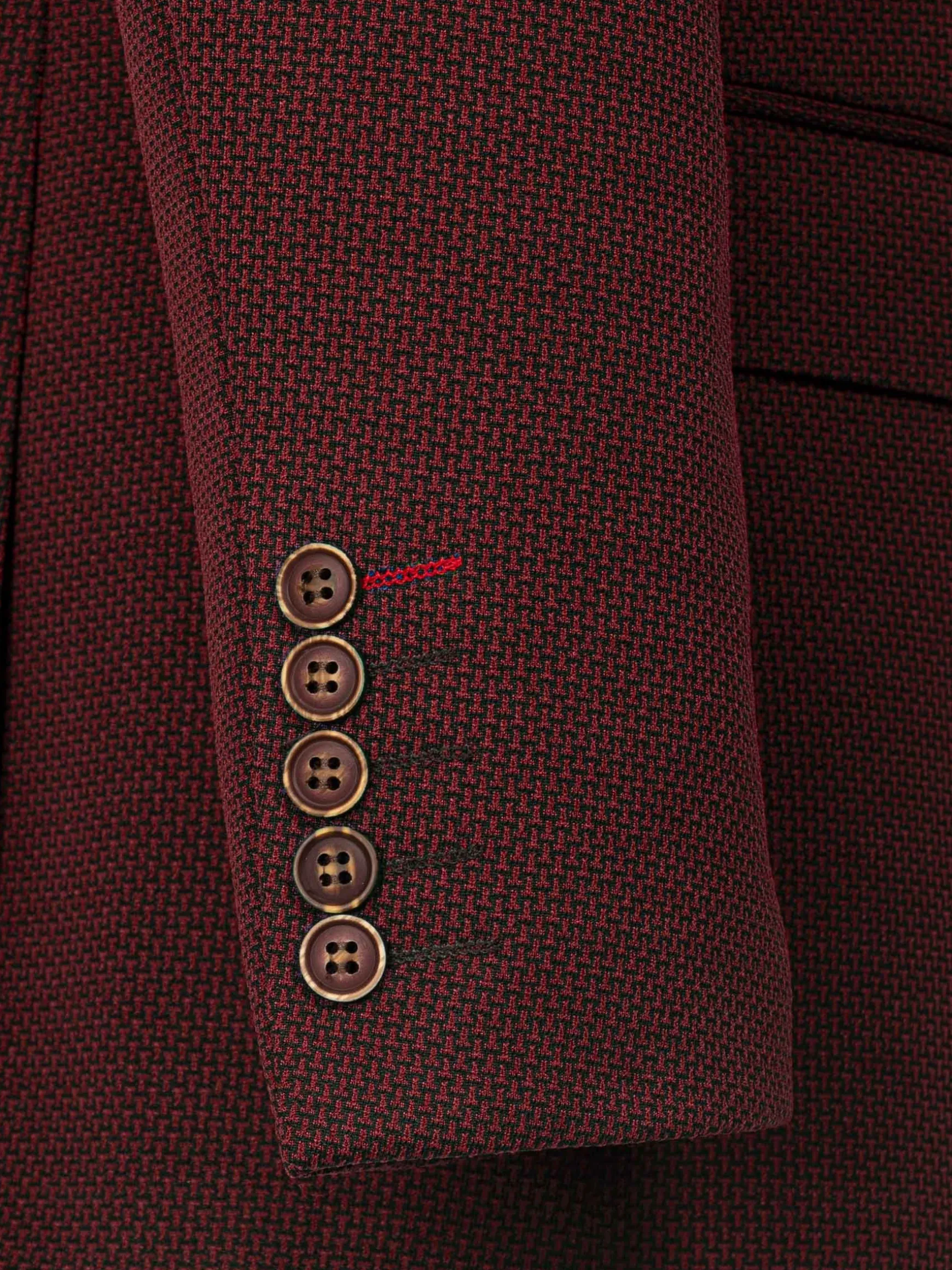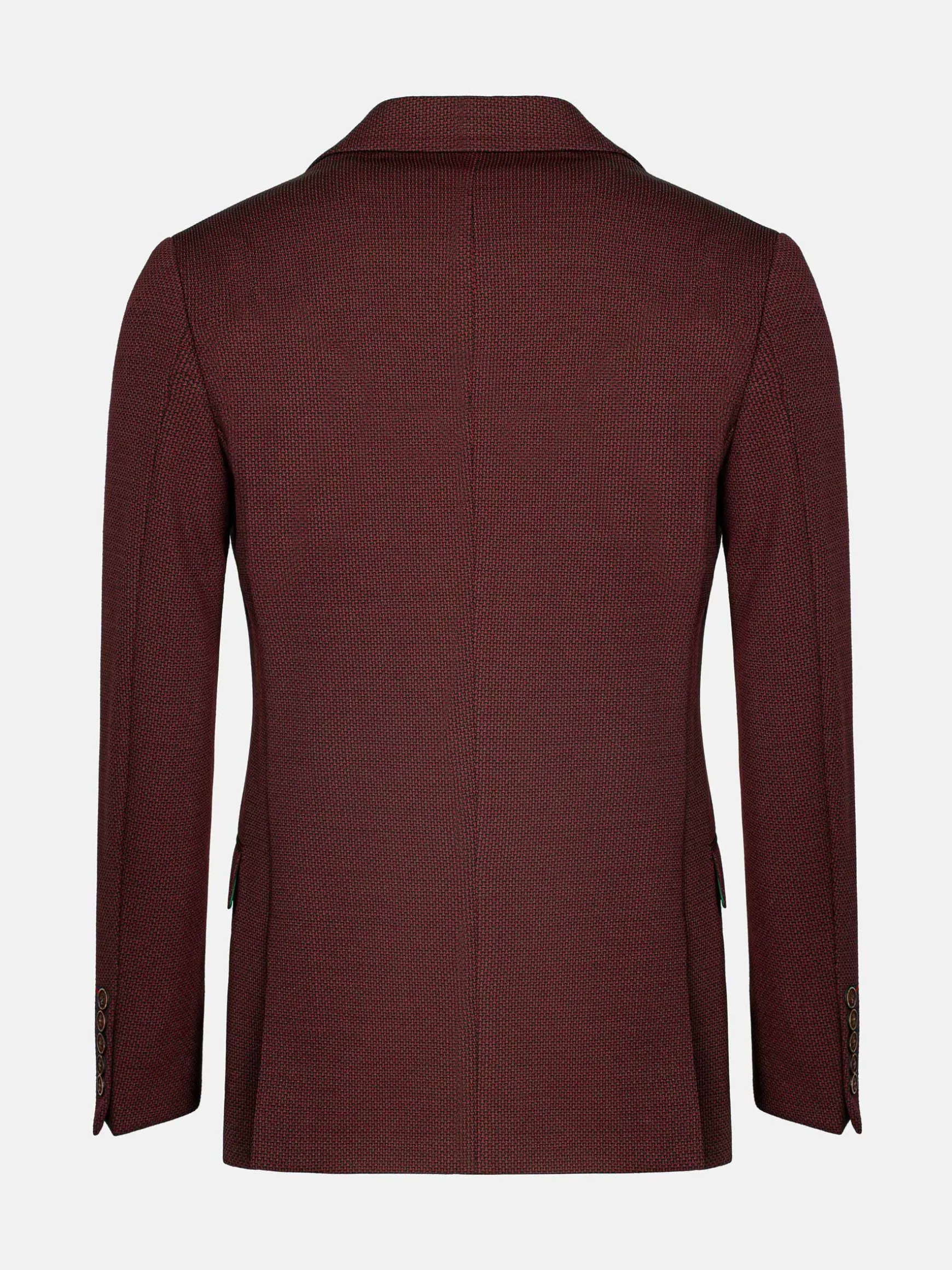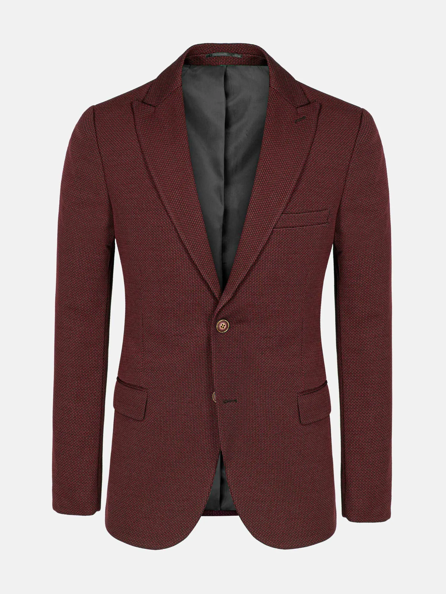 Franco donkerrode blazer, met een kenmerkende textuur van spijkerkopstof. Deze slim-fit blazer biedt een gestroomlijnde look met een single-breasted ontwerp en Peak revers. Het heeft praktische details zoals binnen- en klepzakken, samen met een paspelzak op de borst voor extra raffinement. Compleet met vijf hoornen knopen en twee zijopeningen aan de achterkant, combineert deze blazer elegantie met functionaliteit voor een opvallend ensemble. Perfect voor elke gelegenheid.
