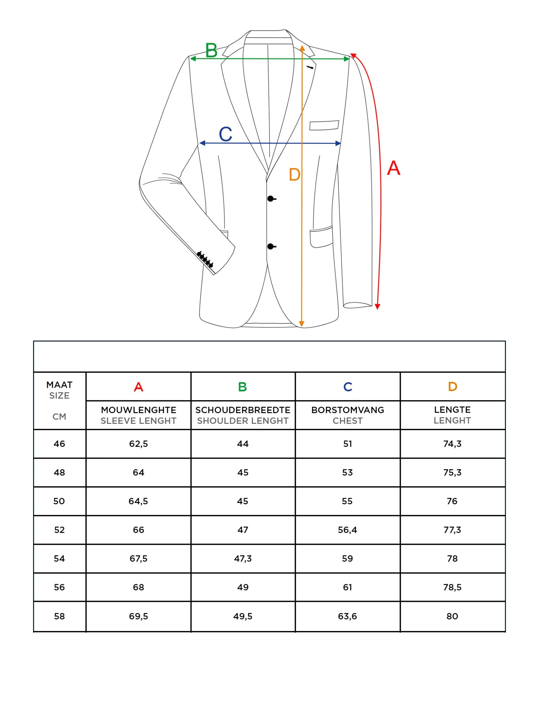 Het bestaat uit 41% wol 54% polyester 05% elastaan. Om de kwaliteit te behouden, raden we aan deze blazer alleen chemisch te wassen. Niet bleken. Strijken op maximaal 110 °C.
