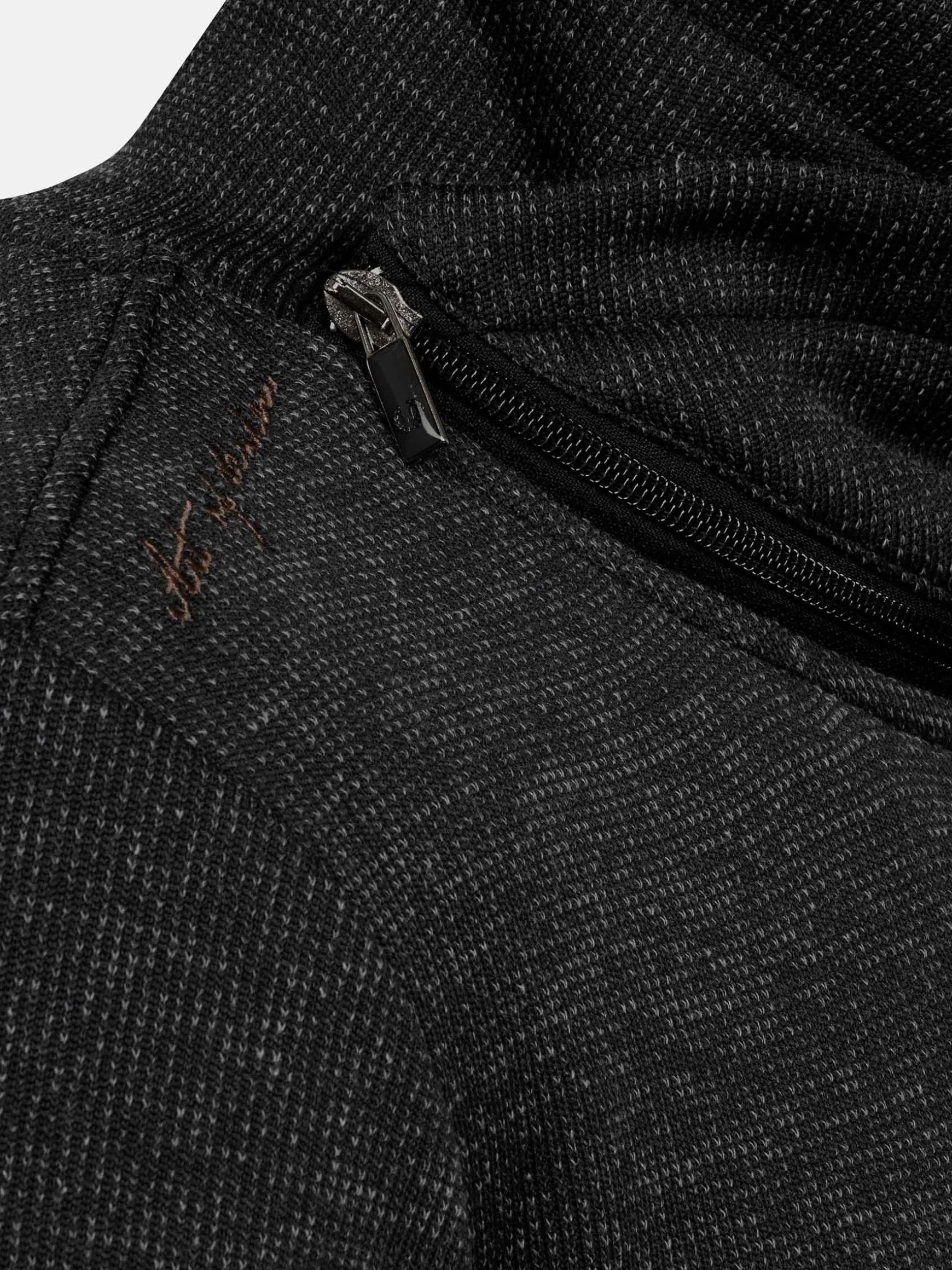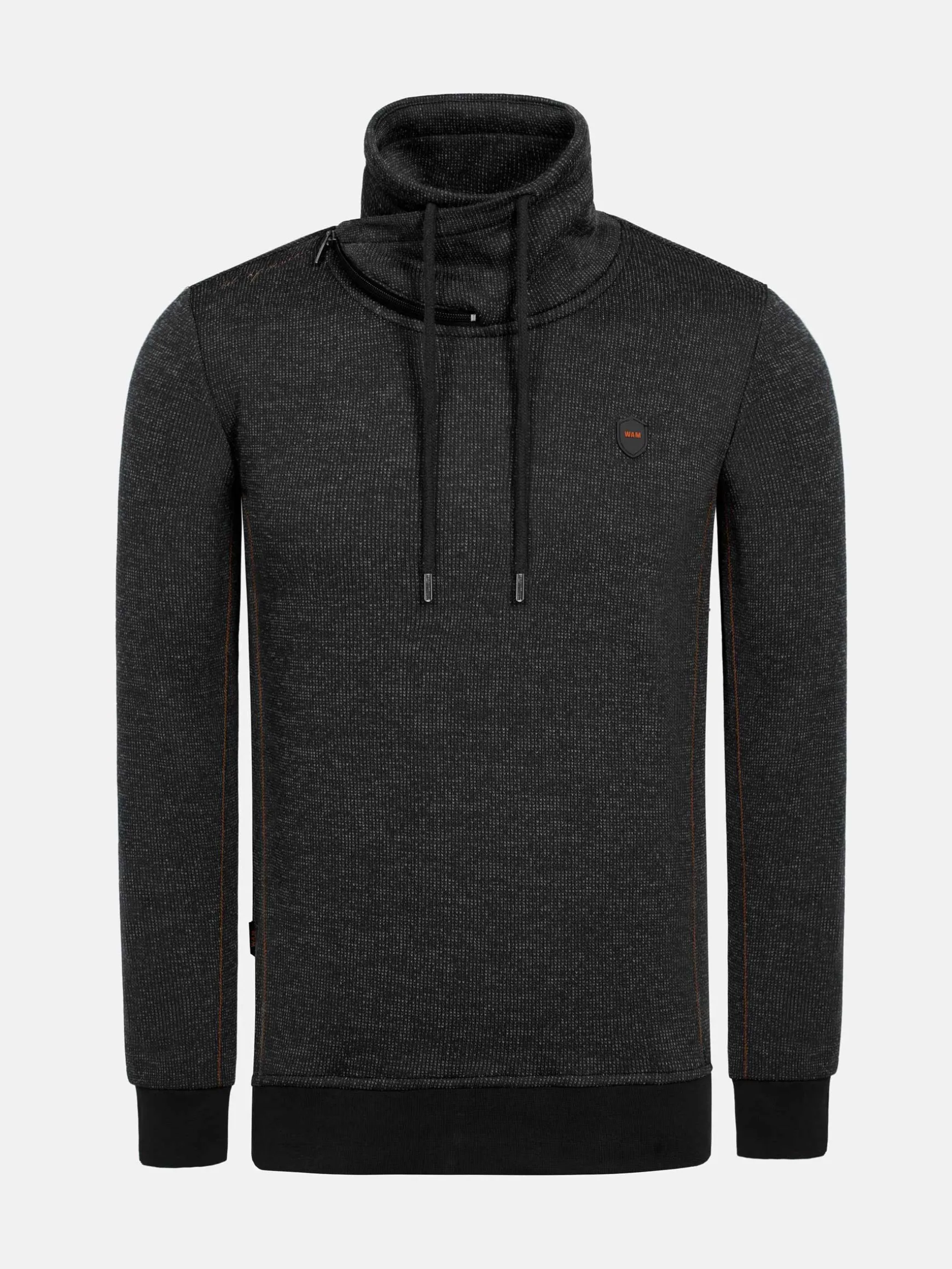De Cain High Neck Black Sweater heeft een gestroomlijnde geometrische textuur, een hoge hals met gedeeltelijke rits voor aanpasbaar comfort en contrasterende bruine schouders voor een sportieve touch. Hij is gemaakt van stretchstof met geribde zoom en manchetten en biedt warmte, ademend vermogen en een verfijnde look.