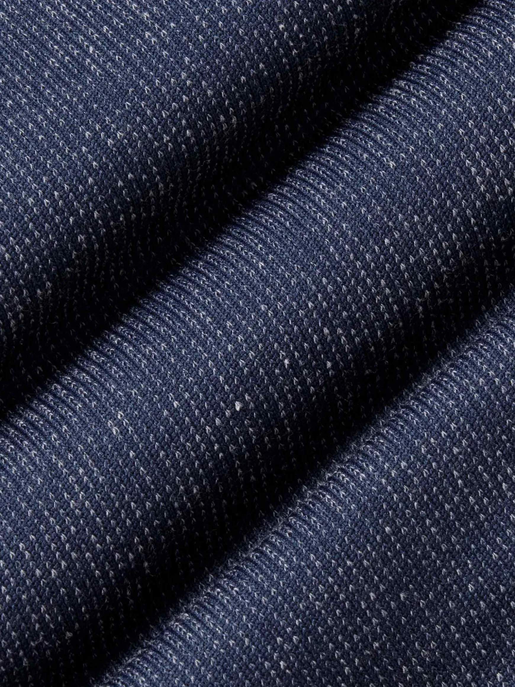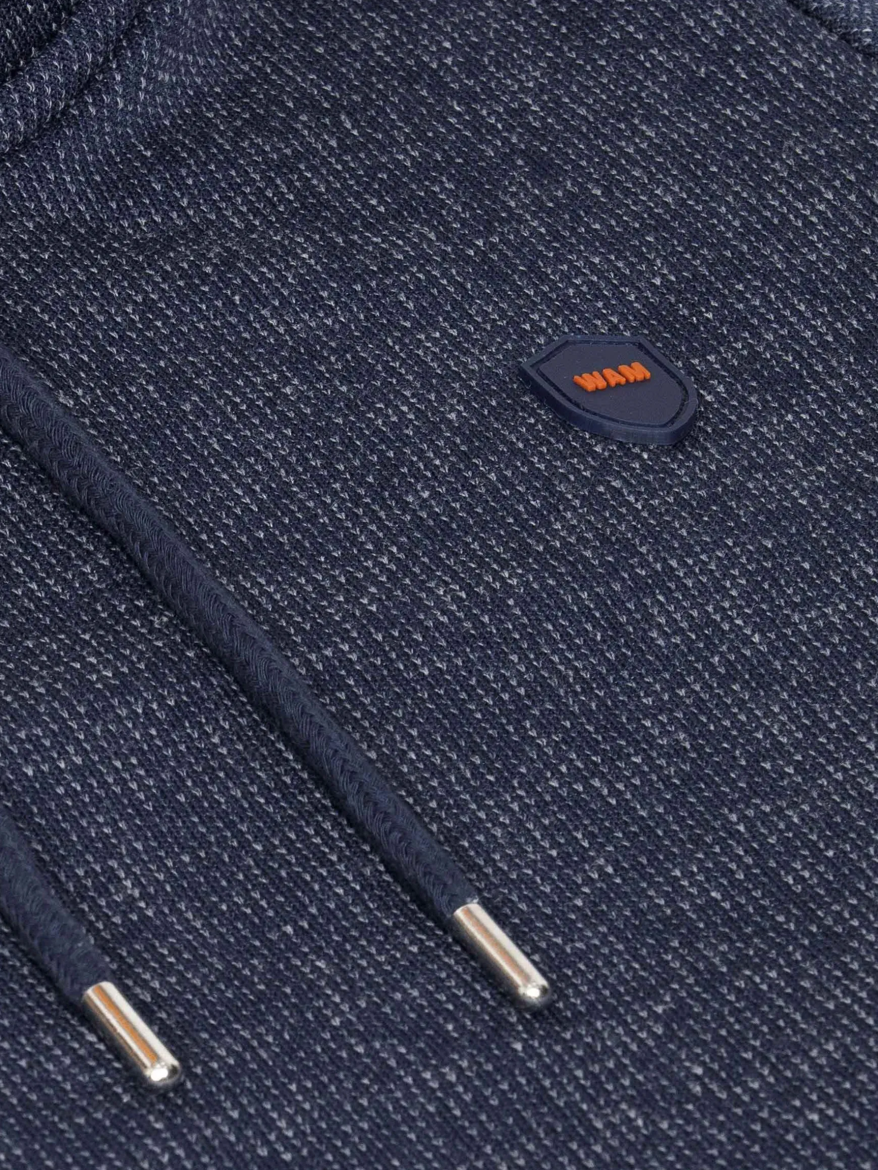 De Cain High Neck Navy Sweater heeft een gestroomlijnde geometrische textuur, een hoge hals met gedeeltelijke rits voor aanpasbaar comfort en contrasterende bruine schouders voor een sportieve touch. Hij is gemaakt van stretchstof met geribde zoom en manchetten en biedt warmte, ademend vermogen en een verfijnde look.