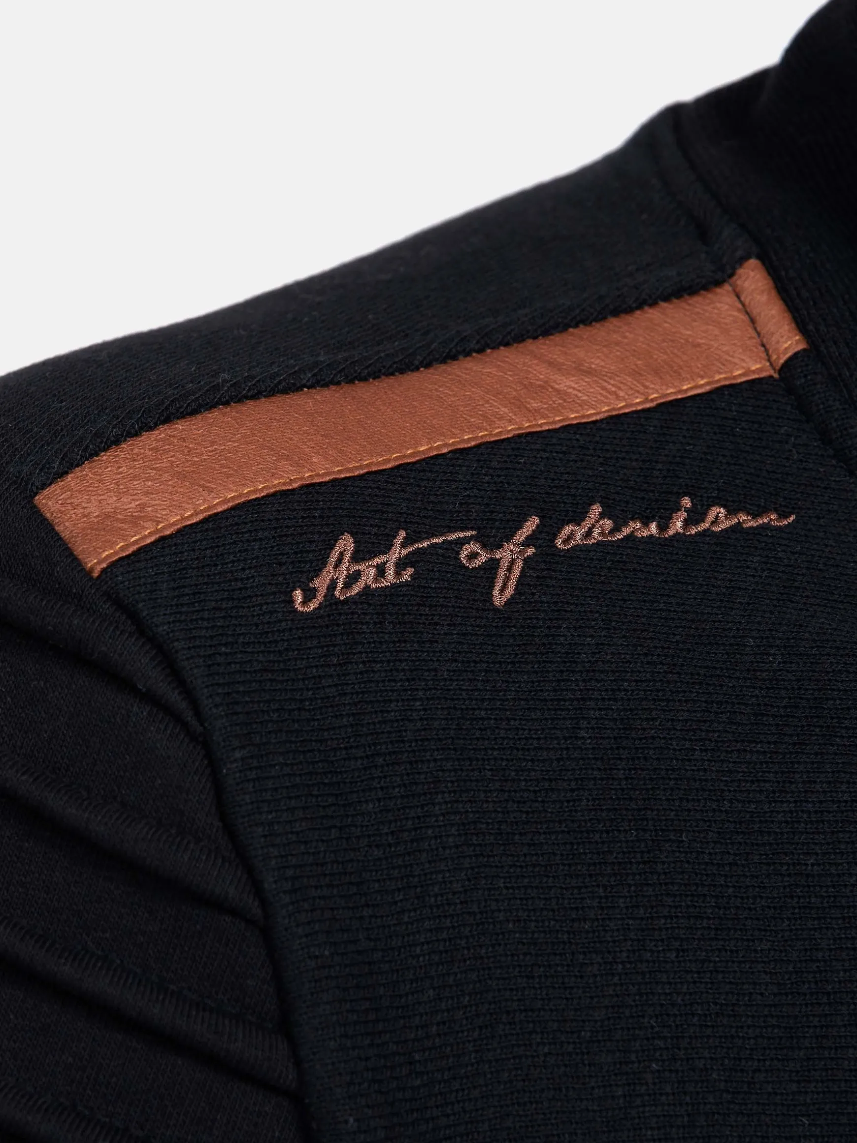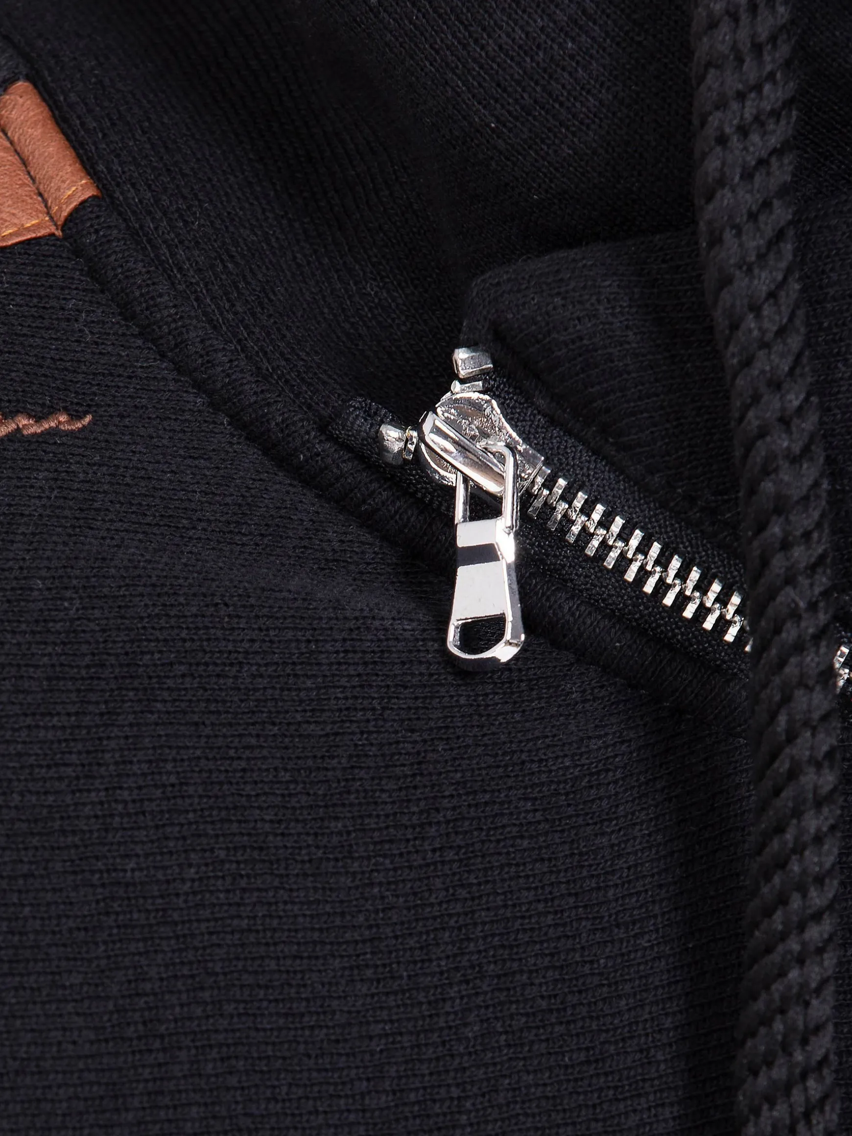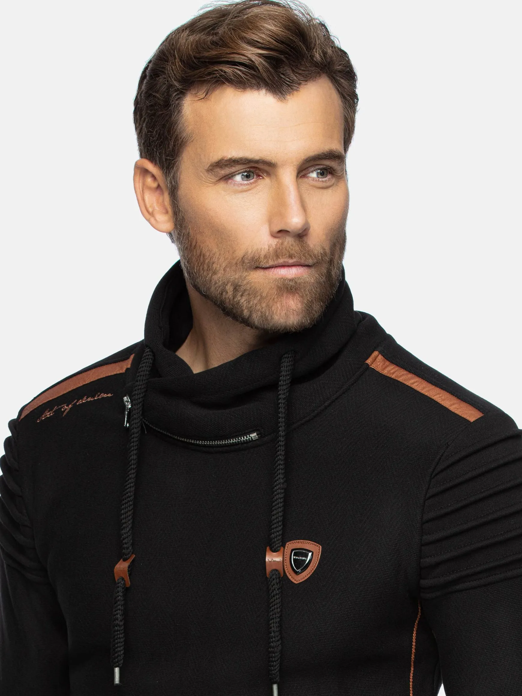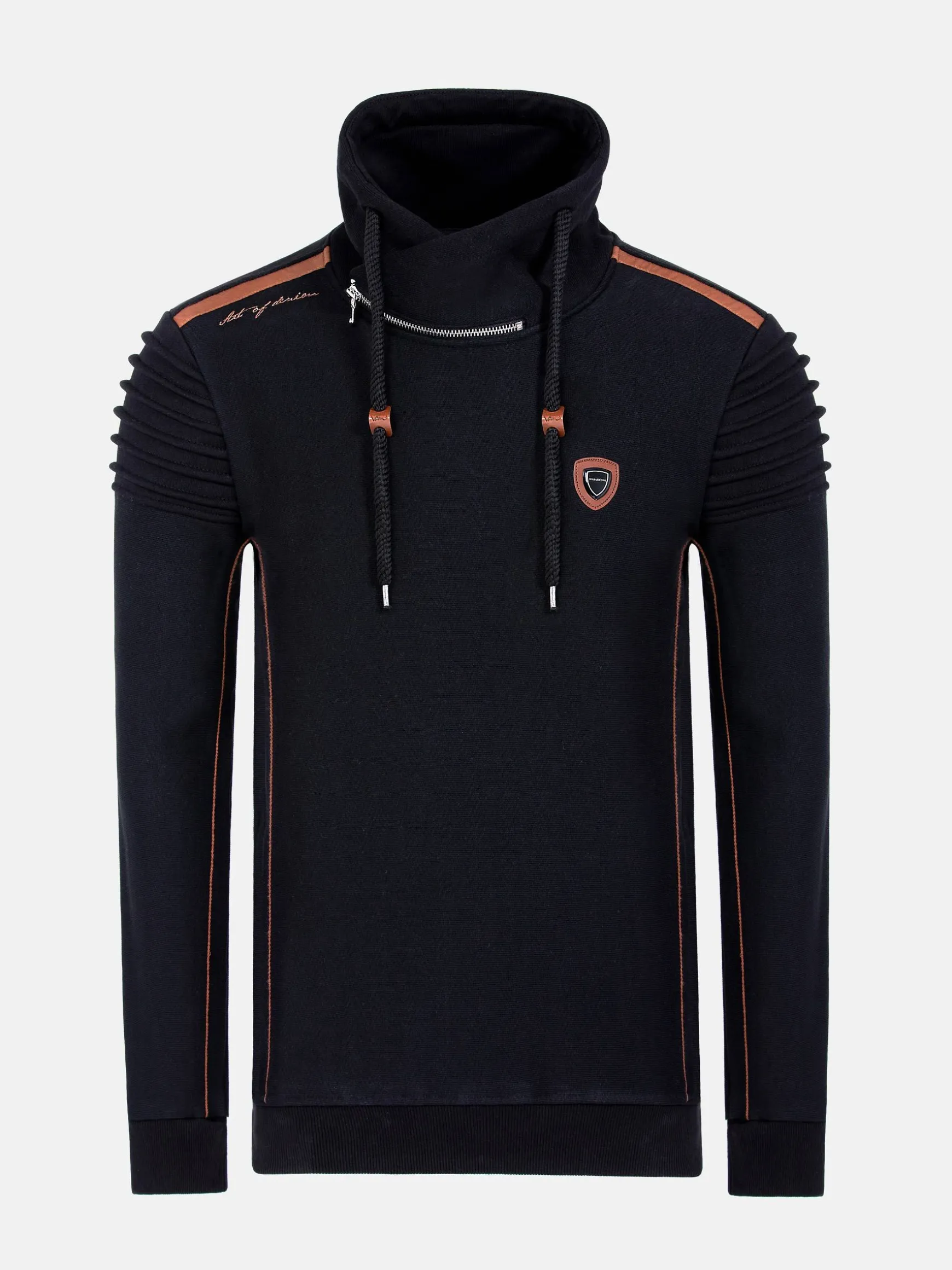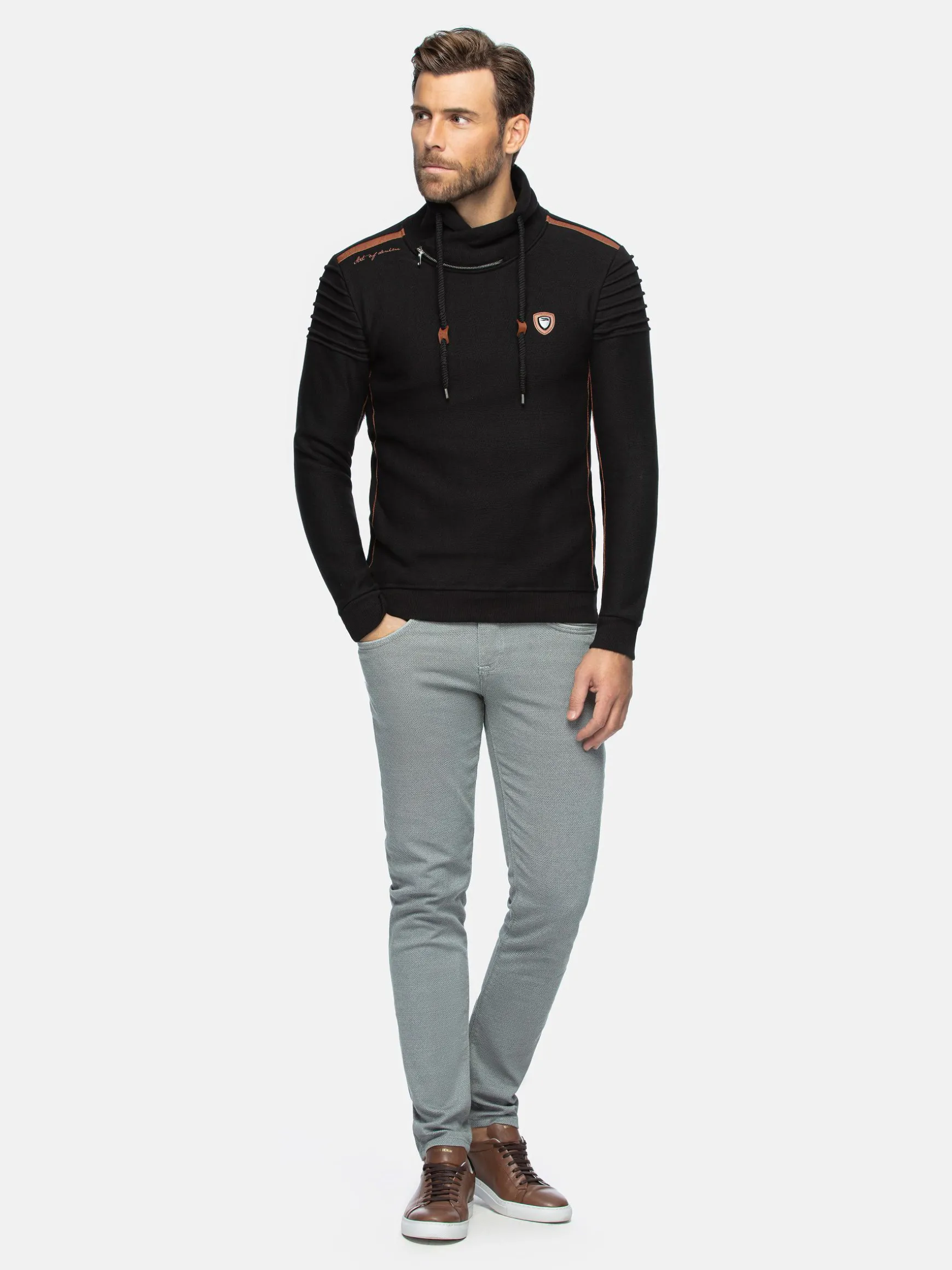Zwarte sweater met bruine elementen, een opstaande kraag, trekkoord en een decoratieve ritssluiting in de hals. Op de linkerborst heeft deze sweater een merkembleem. De elastische zoom en manchetten sluiten perfect. Een modieuze, warme sweater voor de koude dagen.