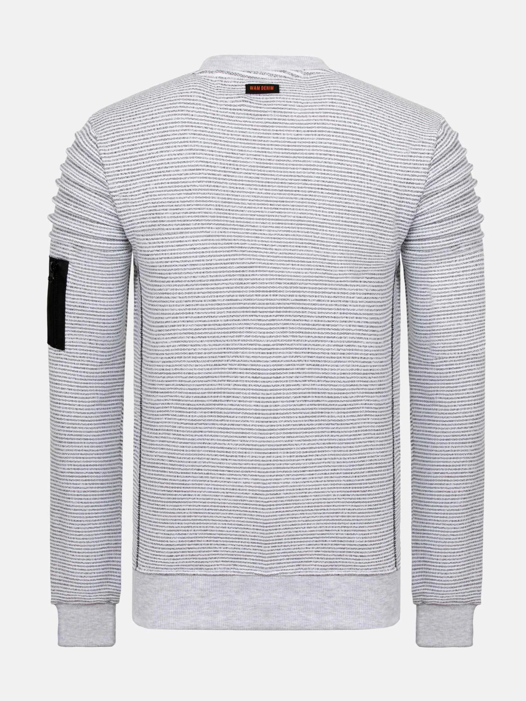 De Karter Crew Neck Grey Sweater heeft een unieke structuurstof, subtiele zwarte accenten op de schouders, fijne horizontale strepen en een klein geborduurd logo. De slanke pasvorm en het stretchmateriaal bieden comfort met stijl. Perfect voor casual tot semi-formeel gebruik.