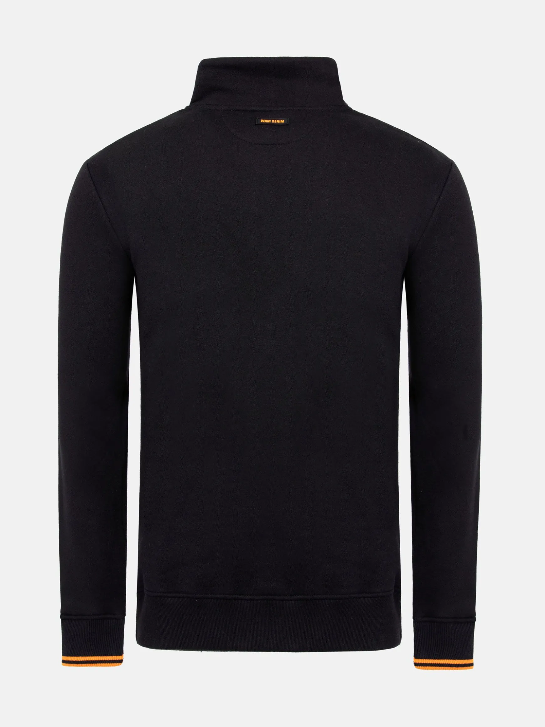 De Santos Black High Neck Sweater is een strak, modern ontwerp met een slanke pasvorm en een hoge hals. Het heeft een functionele halve rits, rekbare stof, een subtiel borstlogo en een contrasterende oranje streep op de geribde boorden en zoom. De klassieke zwarte kleur is veelzijdig en geschikt voor zowel casual als semi-formele gelegenheden.