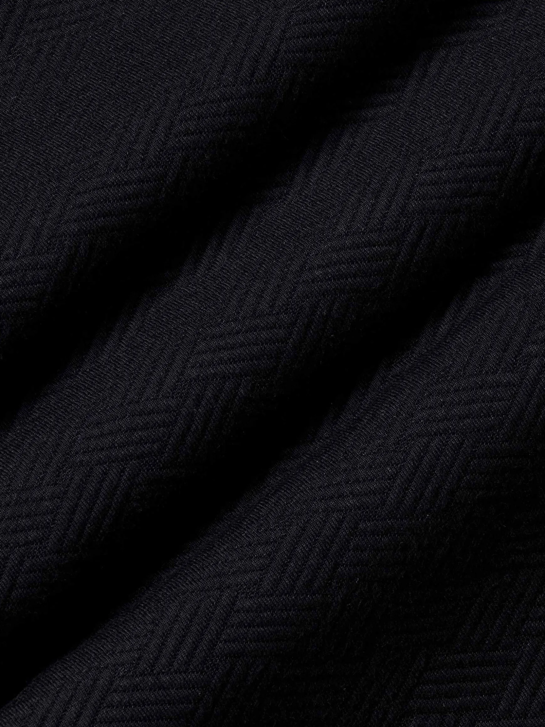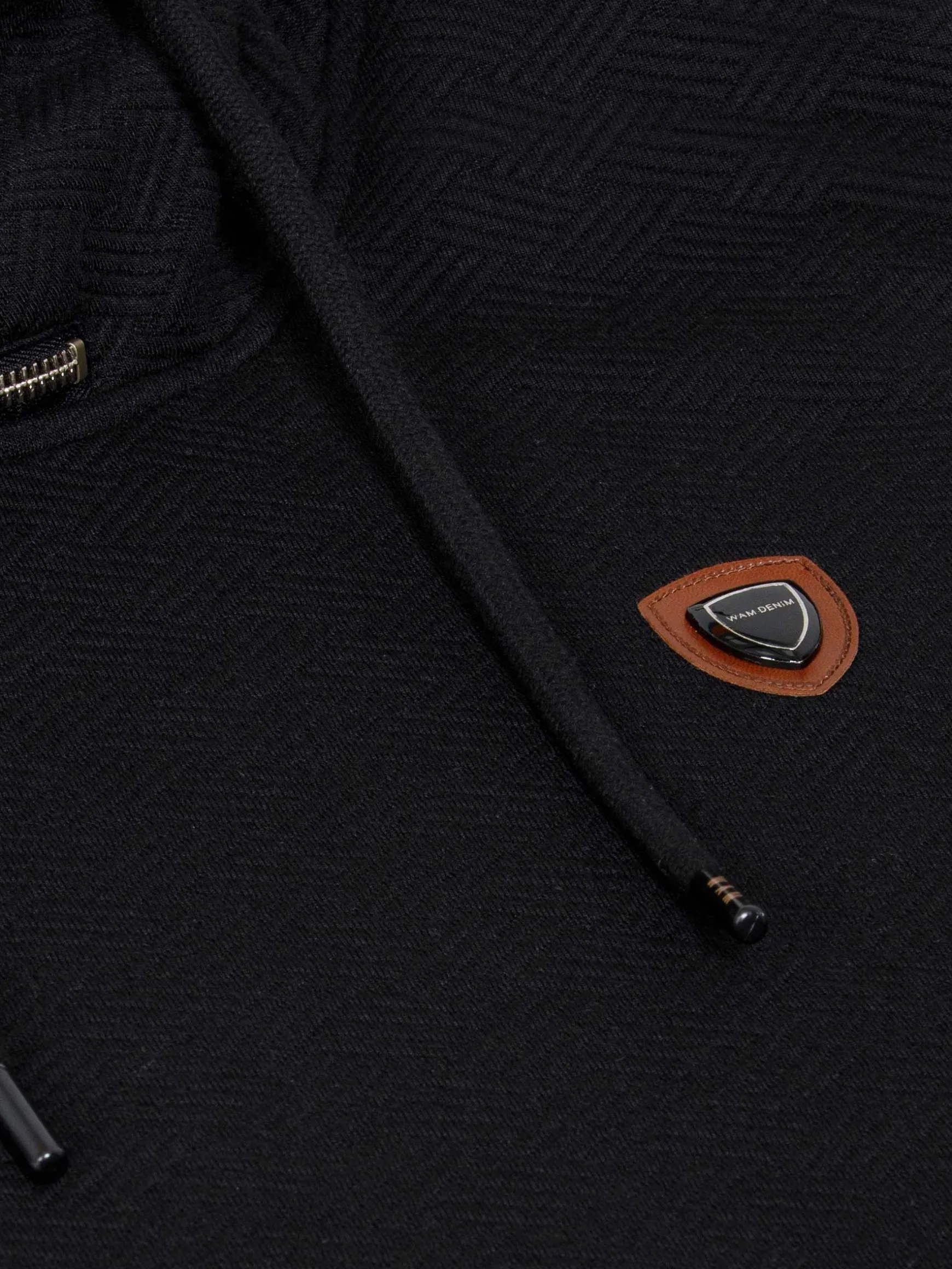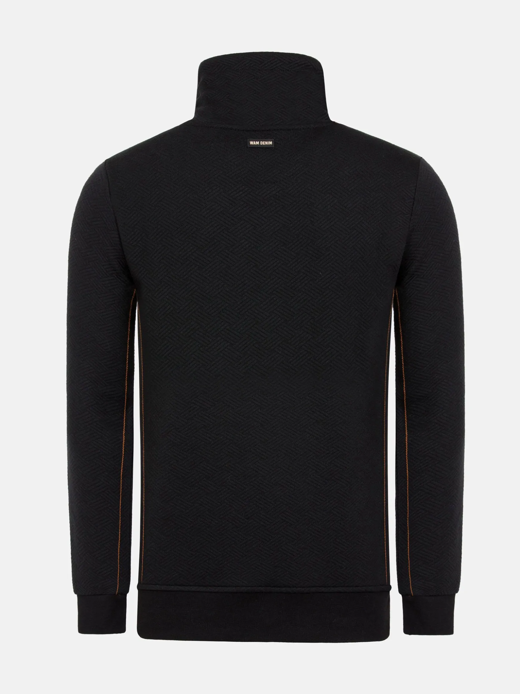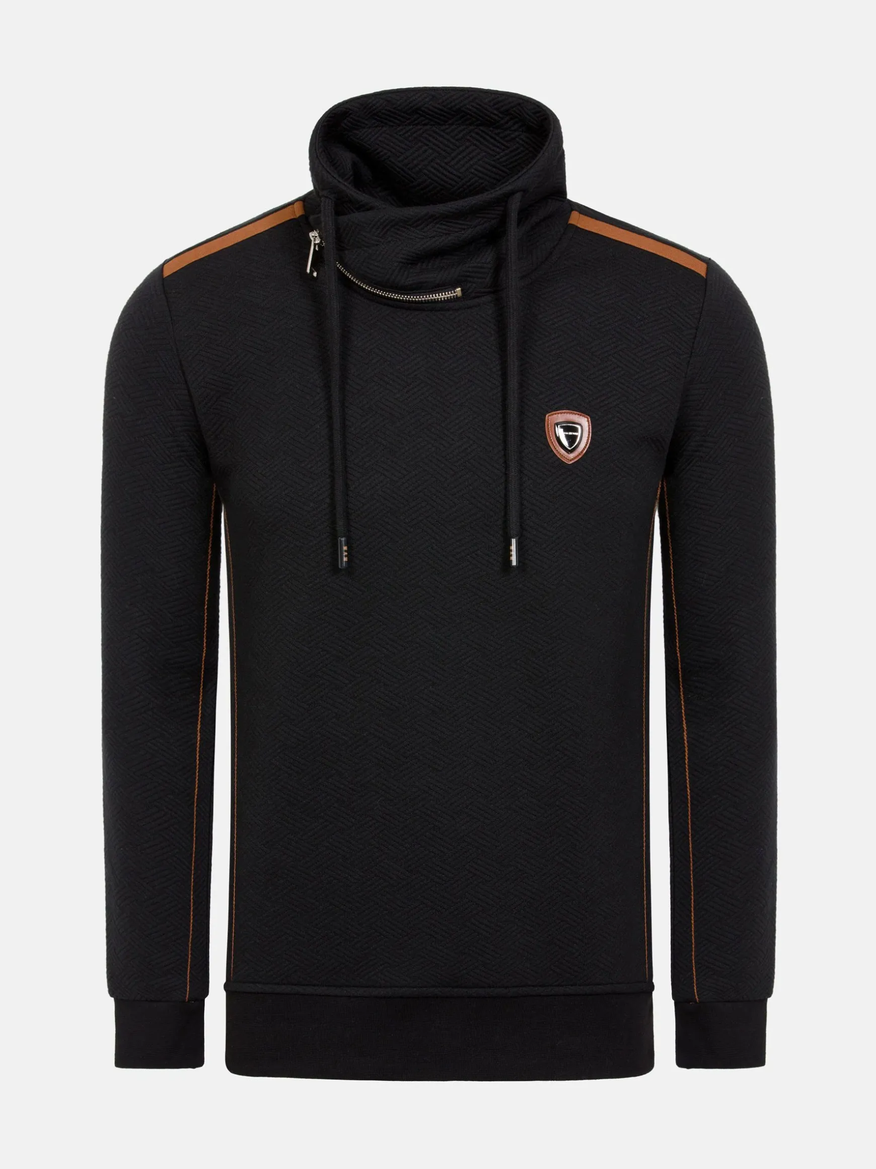 De Solstice Slim Fit Black Sweater heeft een gestroomlijnde geometrische textuur, een hoge hals met gedeeltelijke rits voor aanpasbaar comfort en contrasterende bruine schouders voor een sportieve touch. Hij is gemaakt van stretchstof met geribde zoom en manchetten en biedt warmte, ademend vermogen en een verfijnde look.