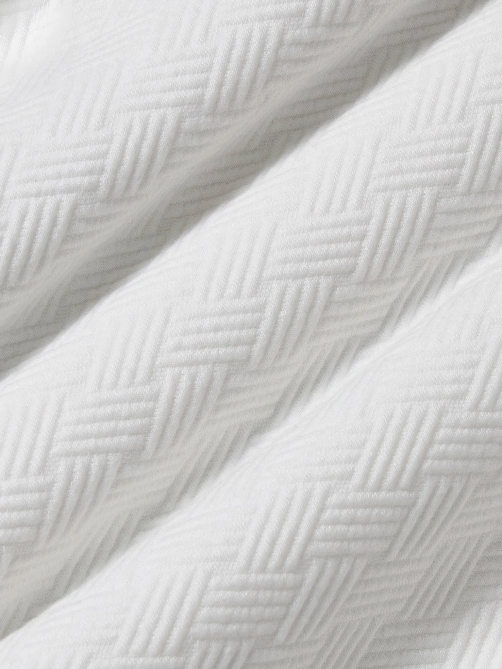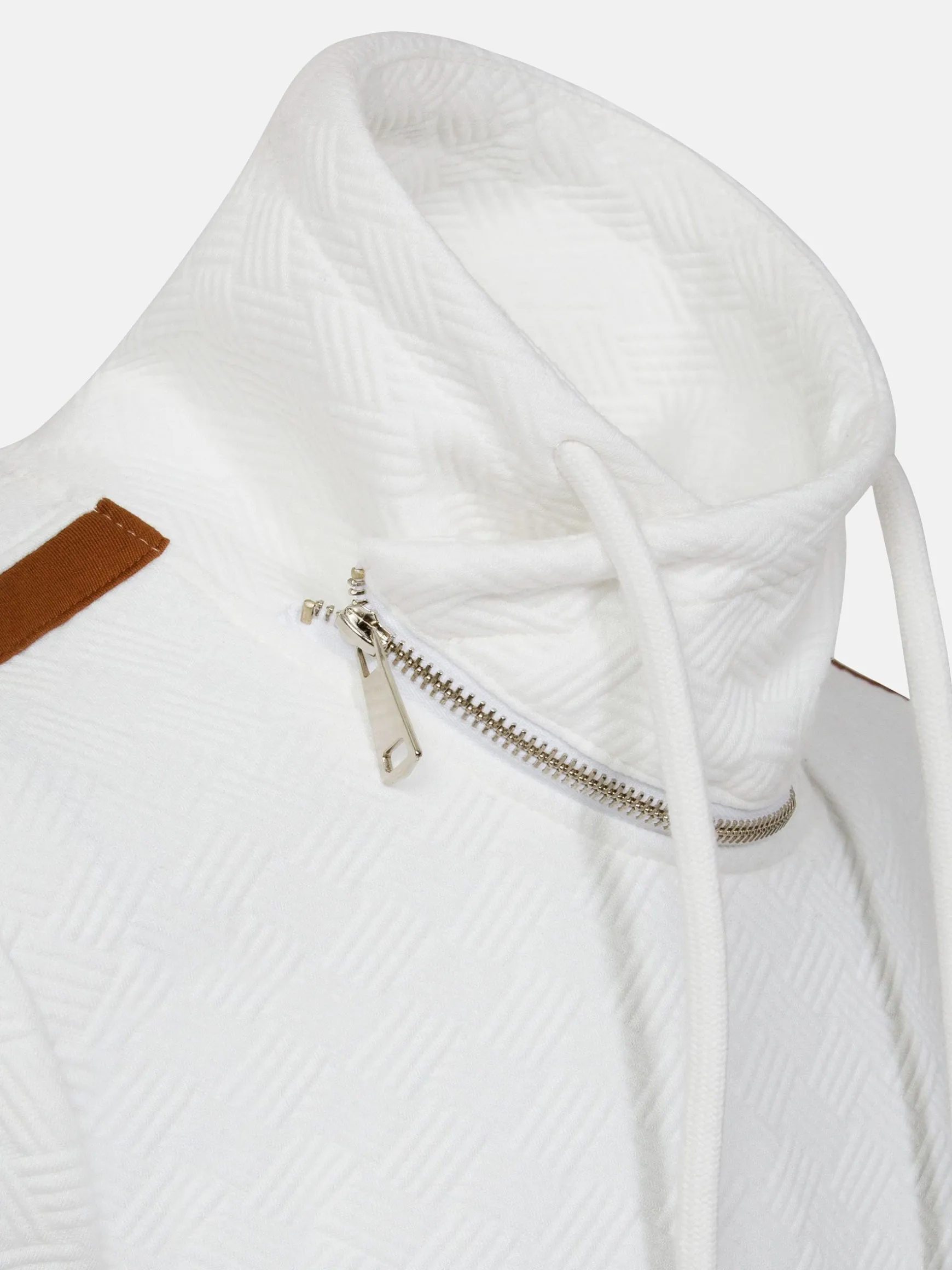 De Solstice Slim Fit Off White Sweater heeft een gestroomlijnde geometrische textuur, een hoge hals met gedeeltelijke rits voor aanpasbaar comfort en contrasterende bruine schouders voor een sportieve touch. Hij is gemaakt van stretchstof met geribde zoom en manchetten en biedt warmte, ademend vermogen en een verfijnde look.