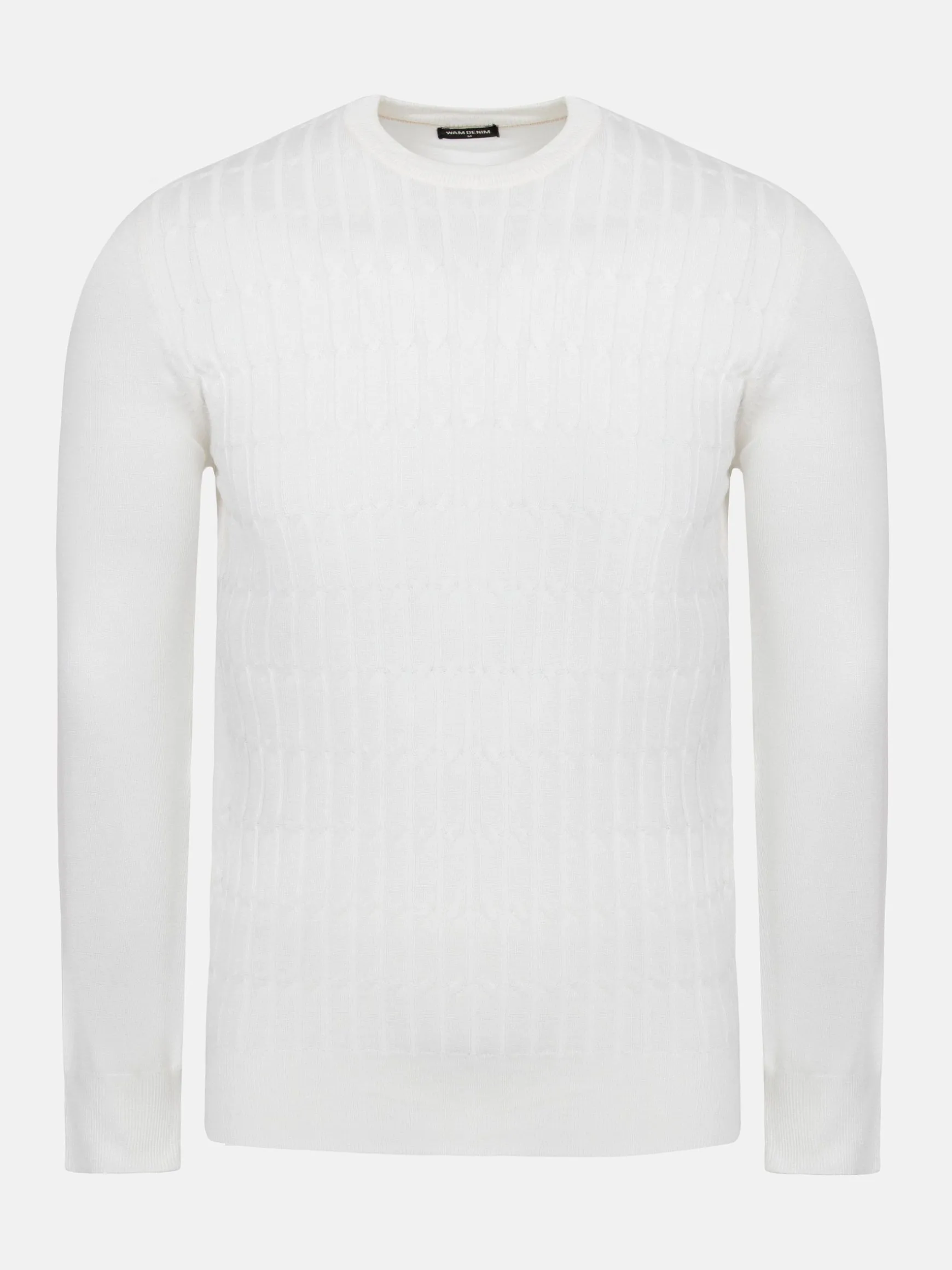 The Ruth Crew Neck Pullover combines simplicity with refined style. Designed in a timeless crew neck silhouette, this Off White pullover features an elegant textured knit pattern on the front, adding depth and dimension to its minimalistic design. The soft, high-quality fabric offers comfort and warmth, making it perfect for cooler days. Ribbed detailing on the cuffs and hem ensures a snug fit, while the versatile Off White shade makes it an essential layering piece for any occasion.