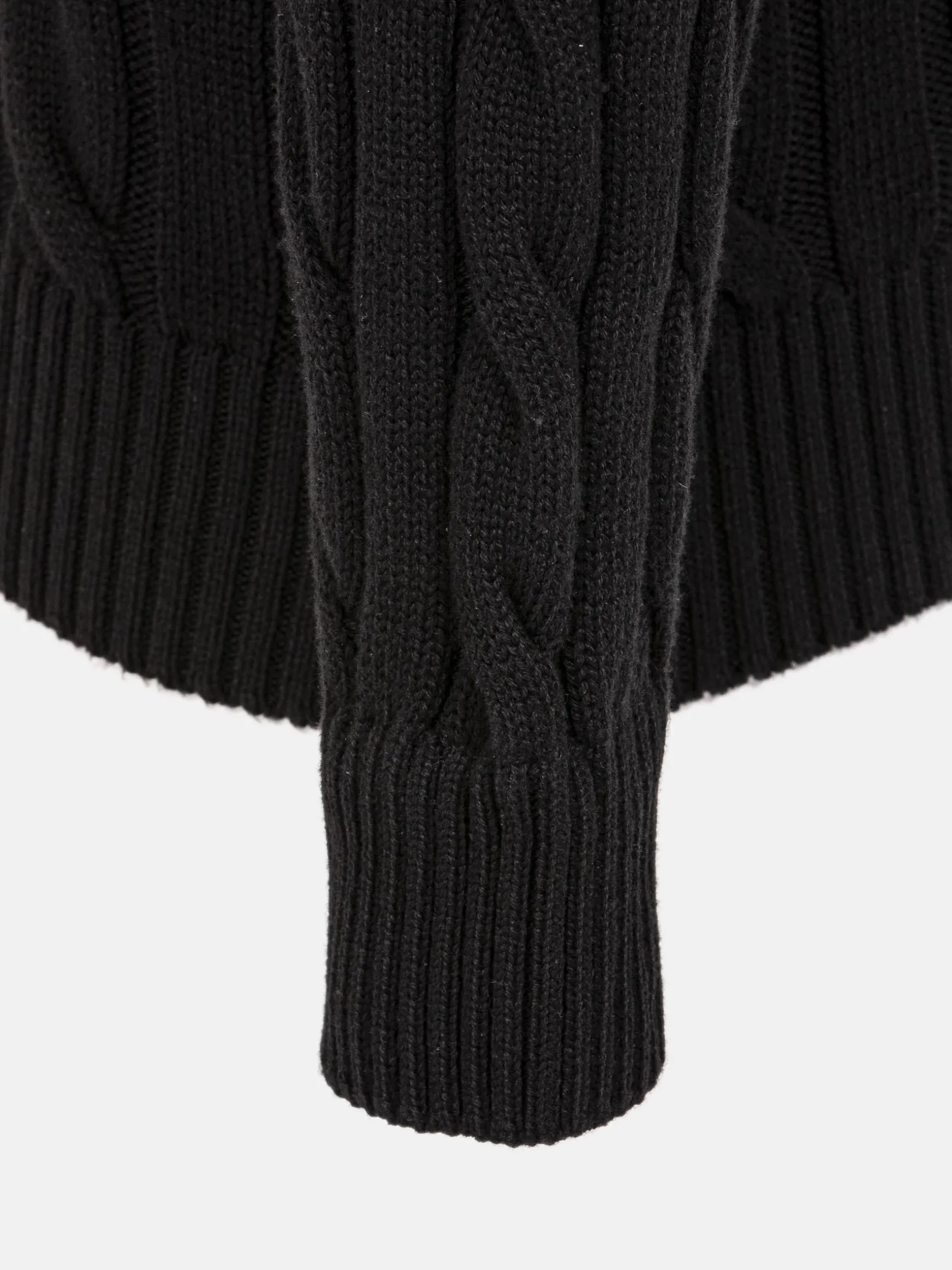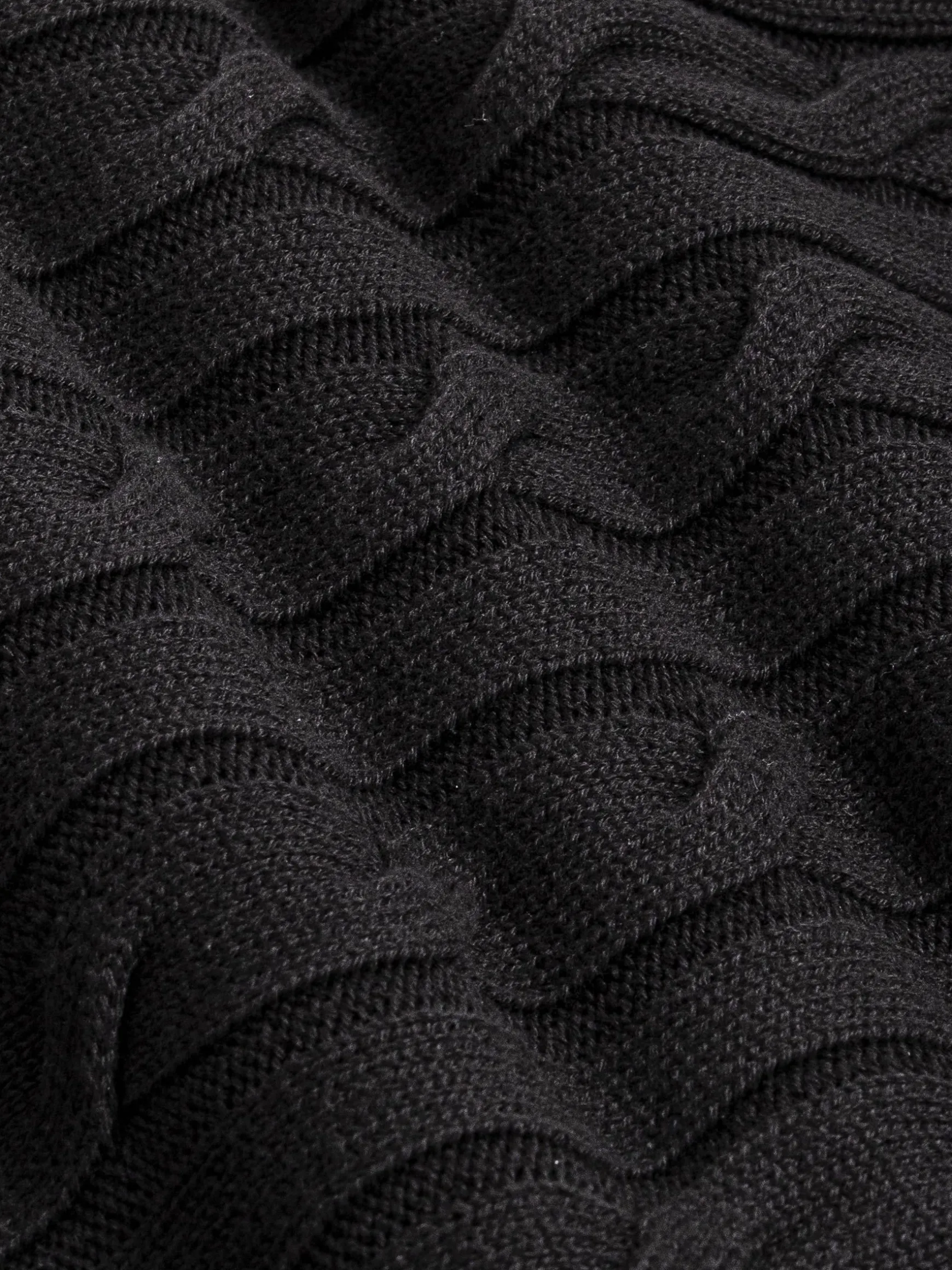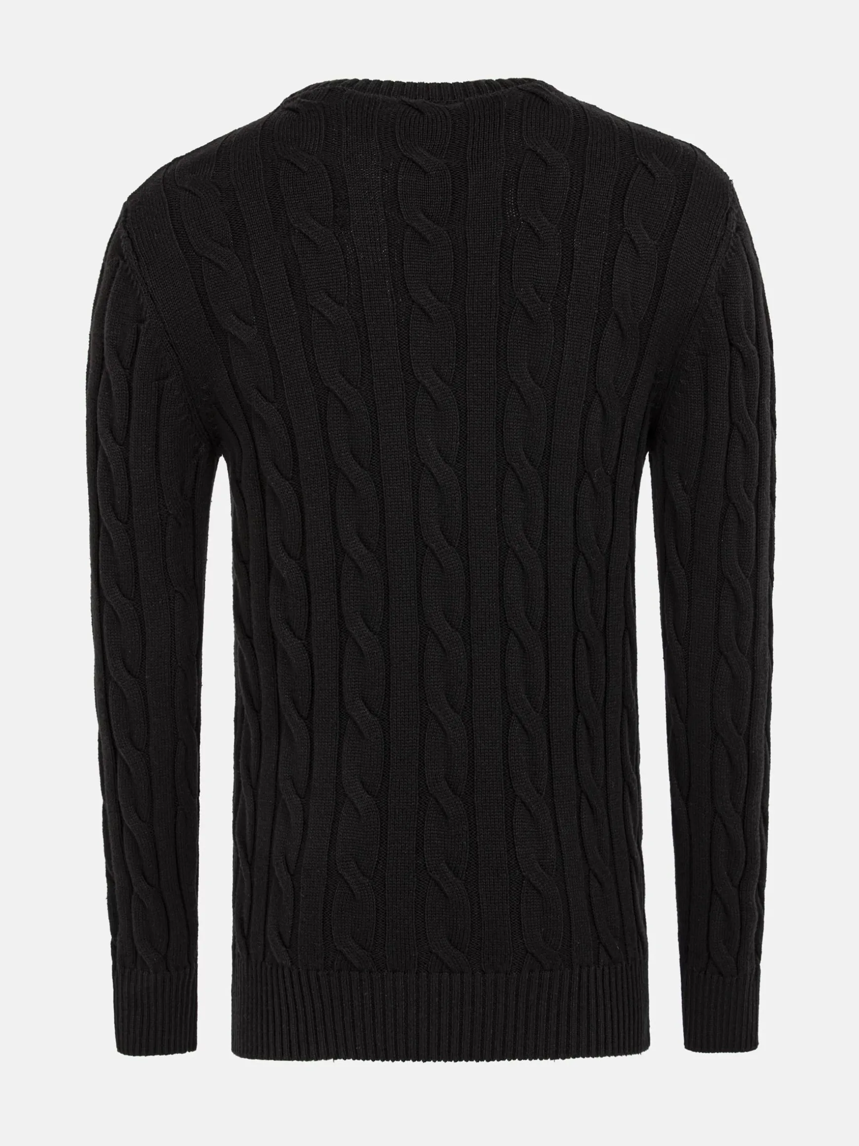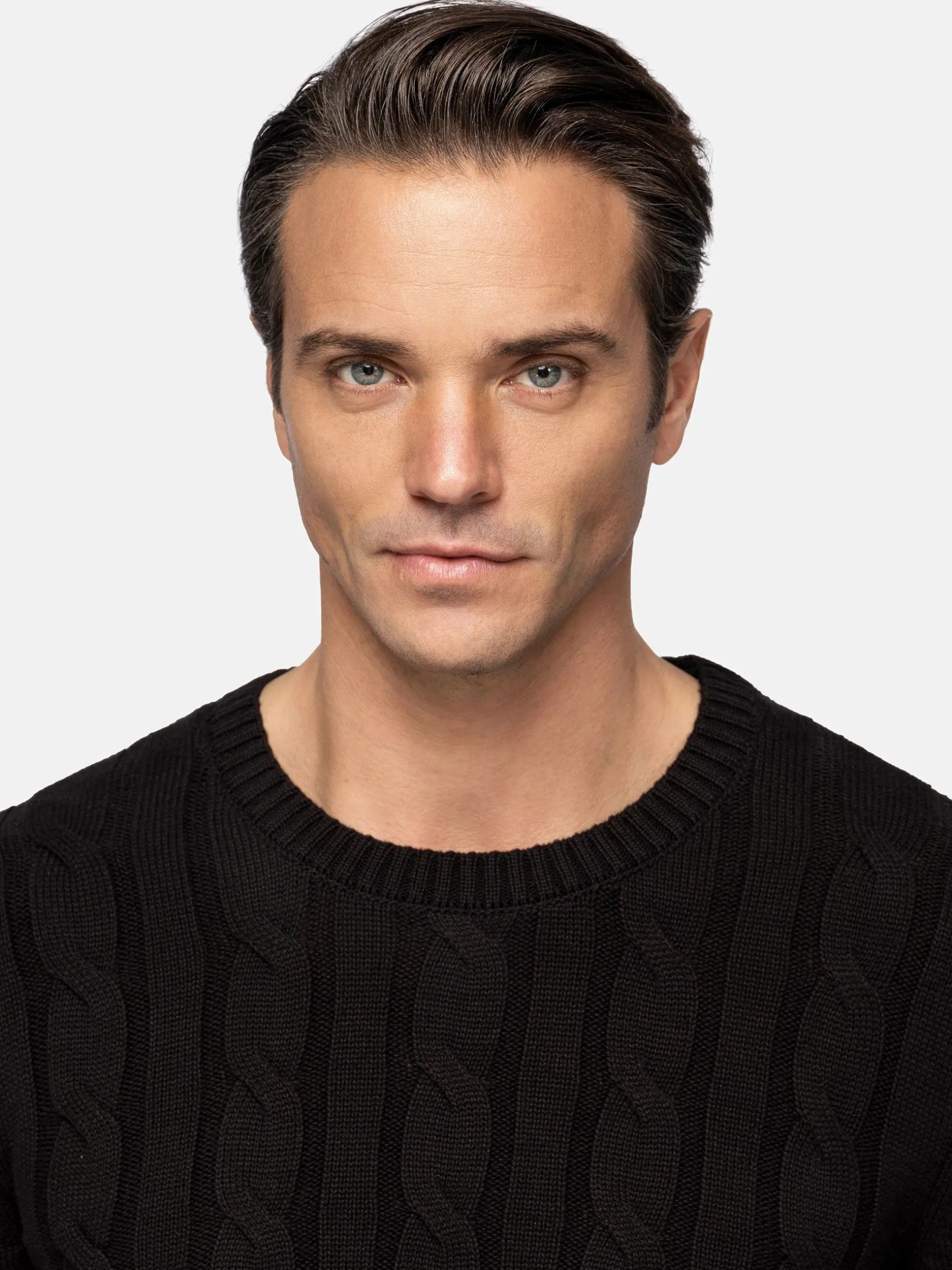 Een zachte trui in een glanzend zwarte kleur met een ronde hals en geribde boorden. De textuur van de stof voegt een elegante stijl toe. Perfect te dragen bij een jeans voor een smart casual style.