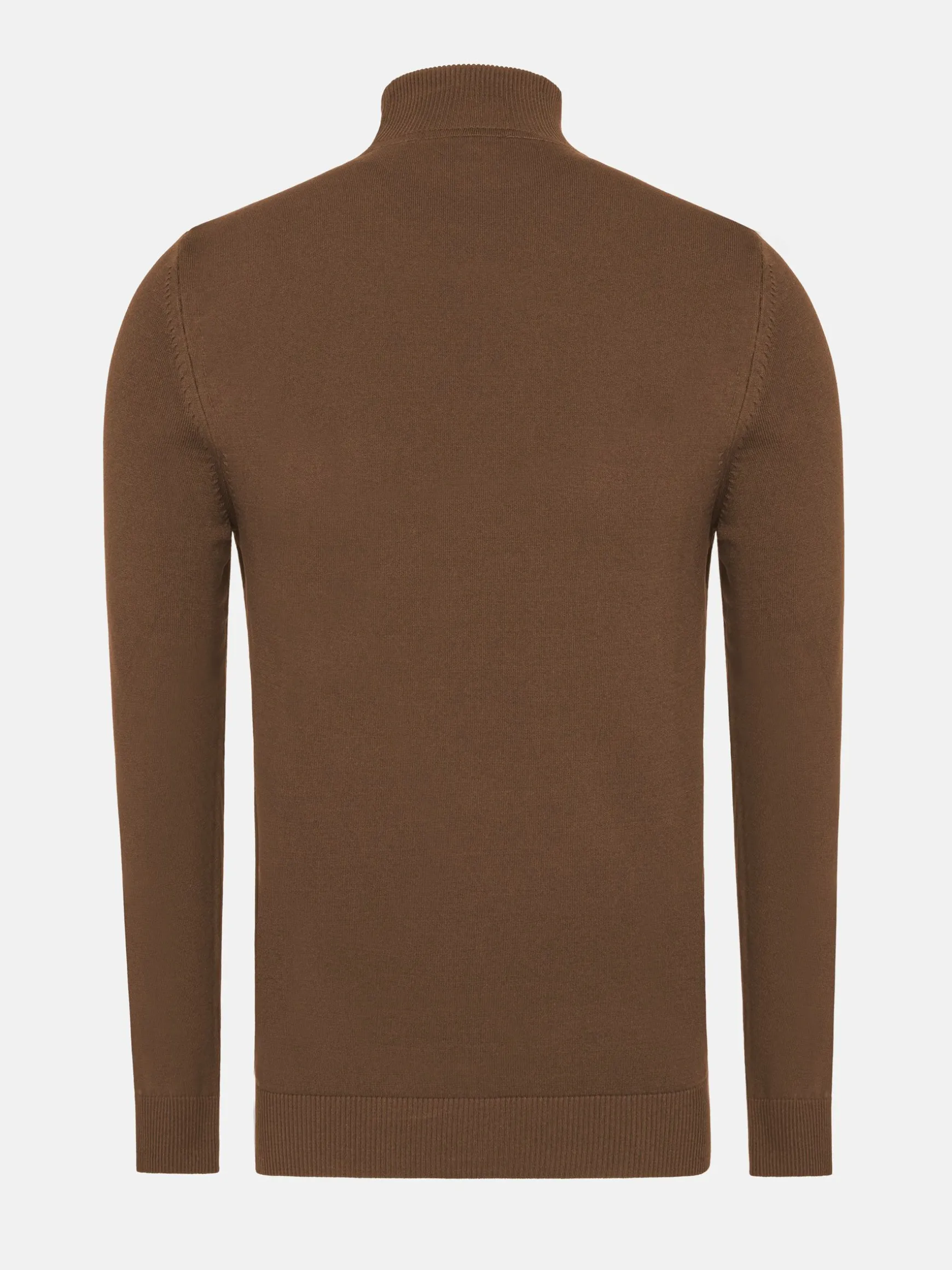 Stijlvolle coltrui in een effen peru kleur. Draag licht en comfortabel, gemaakt van zachte viscose, gemengd met polyamide voor meer comfort. Als stijldetail heeft de sweater een geribbelde manchet en taille voor een moderne look. Dit model is ook in donkerbruin verkrijgbaar.